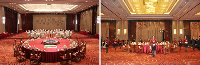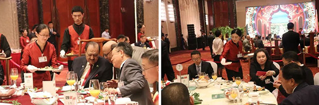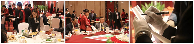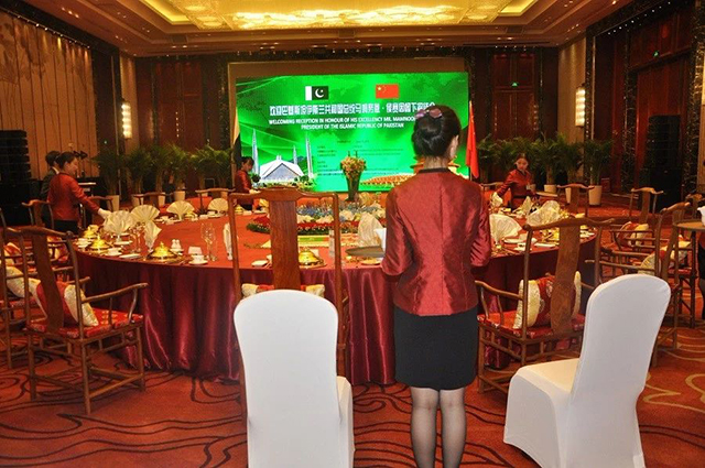 巴基斯坦國家領導人馬姆努恩·侯賽因總統的招待會設在酒店鑫江廳,寬敞明亮的空間、優雅舒適的布置、細致用心的服務、訂制的特色美食讓總統貴賓一行連連稱贊。主桌中巴友好的沙盤更是由酒店員工根據食材親自制作完成,酒店的極致用心獲得了國外來賓的點贊。