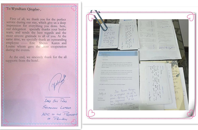 巴基斯坦總統馬姆努恩·侯賽因(Mr.Mamnoon Hussain)及貴賓一行對酒店的服務表示稱贊和滿意。峰會期間,酒店員工用心的服務收到了國內外貴賓近40封表揚信,臨別之時,馬姆努恩·侯賽因總統更是贈送禮物,對酒店全體員工表示感謝。