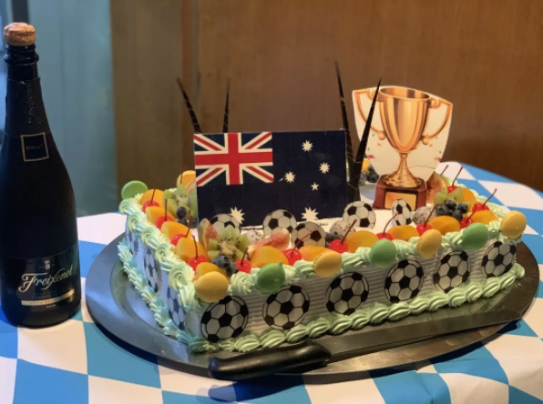 酒店還為球隊準備了印有獎杯、足球元素的蛋糕、和香檳,慶祝勝利。