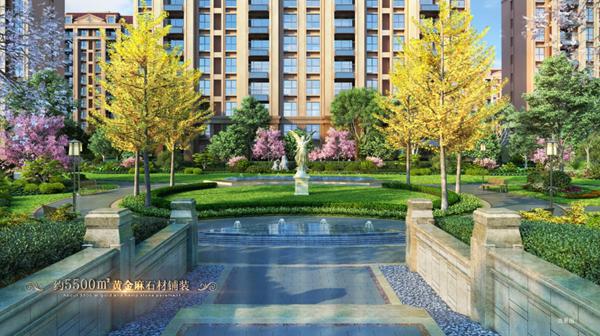 用料十足的石材鋪裝,更是令人感受滿滿的匠心與誠意。整個園區石材鋪裝面積達5500㎡,選用足足5厘米厚的荔枝面黃金麻石,造價是普通燒結磚鋪裝的兩倍以上,質地細膩考究,讓漫步的美好體驗,延伸到社區的細微角落。