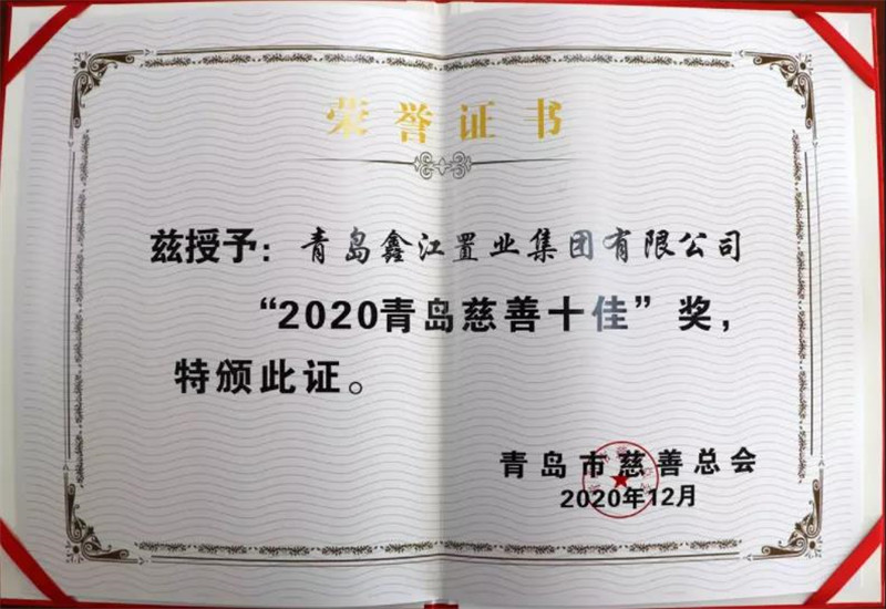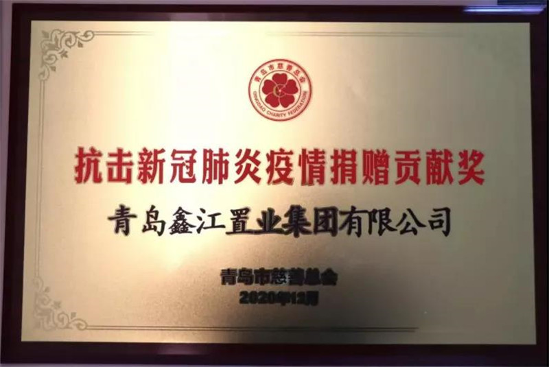 2021年1月,鑫江集團在由青島市慈善總會主辦的2020年度“青島慈善十佳”評選表彰活動中,榮獲“2020 青島慈善十佳”、“抗擊新冠肺炎疫情捐贈貢獻獎”兩項榮譽。