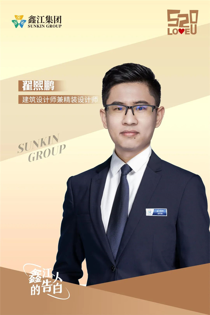 翟熙鵬,建筑設計師兼精裝設計師,堅持鑫江集團對精工質量的要求,也承載著你對美好生活的向往,它理應優雅而溫馨。鑫江人在為你構筑理想家的路上從未止步,時刻用行動訴說愛意。