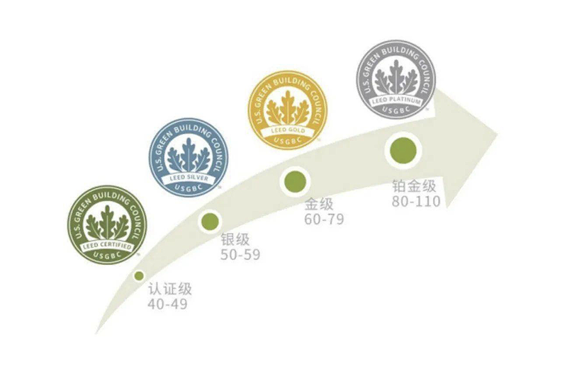 在目前世界各國的綠色建筑評估以及建筑可持續性評估標準中,LEED認證評分體系被認為是最完善、最有影響力的評估標準。就像一場綜合考試,在創新設計、選址與交通、可持續場地、用水效率、能源與大氣、材料與資源、室內環境、地域優先等八大方面對建筑物進行考察評估,對超過69個小項進行評估打分。總分110分,分成:認證級(40–49)、銀級(50–59)、金級(60–79)、鉑金級(80以上)四個等級。